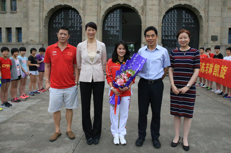 9月6日,我院运动员、三届奥运冠军五金王陈若琳凯旋回校。院党委书记陈国祥、副院长肖爱华和跳水队在校全体人员在中央体育场西司令台前热烈欢迎陈若琳归来。陈国祥书记向陈若琳献花,祝贺她在里约奥运会上取得的辉煌成绩。陈若琳与列队欢迎的跳水队员一一握手致意并与大家合影。