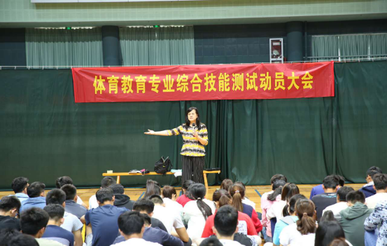 为提升体育教育品牌专业学生的专业技能和综合素质,体育系于2017年6月6日、6月10日在中央体育场、体育馆、田武馆、综合馆、健美操馆等场所对大三体育教育专业全体学生进行了综合技能测试,测试项目包含田径、篮球、排球、足球、健美操、体操、武术操、广播操、模拟授课等基本技能,本次综合技能测试得到了体育系领导的高度重视,体育系主任沈鹤军、副主任王进、副主任陈荣梅亲自到场观摩指导测评工作。