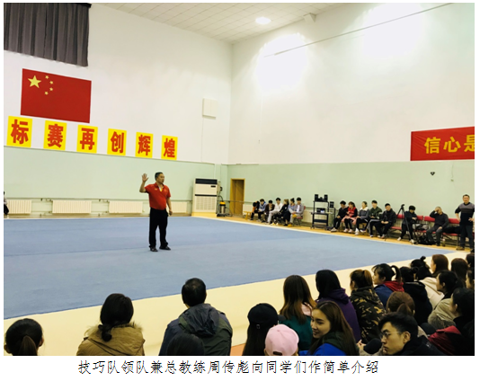 测验前,江苏技巧队领队兼总教练周传彪为同学们作了简单的介绍并对同学们的到来表示了热烈的欢迎。测验间隙,竞技训练学院党总支书记丁习明从参赛队伍情况、技巧项目的设置、成套动作的分类、难度动作的形成以及如何从艺术的角度来欣赏技巧项目作了详细的讲解,使我们的同学对该项目有了更直观的了解,从实践中获取了专业知识,起到了学训融合促发展的人才培养效果。