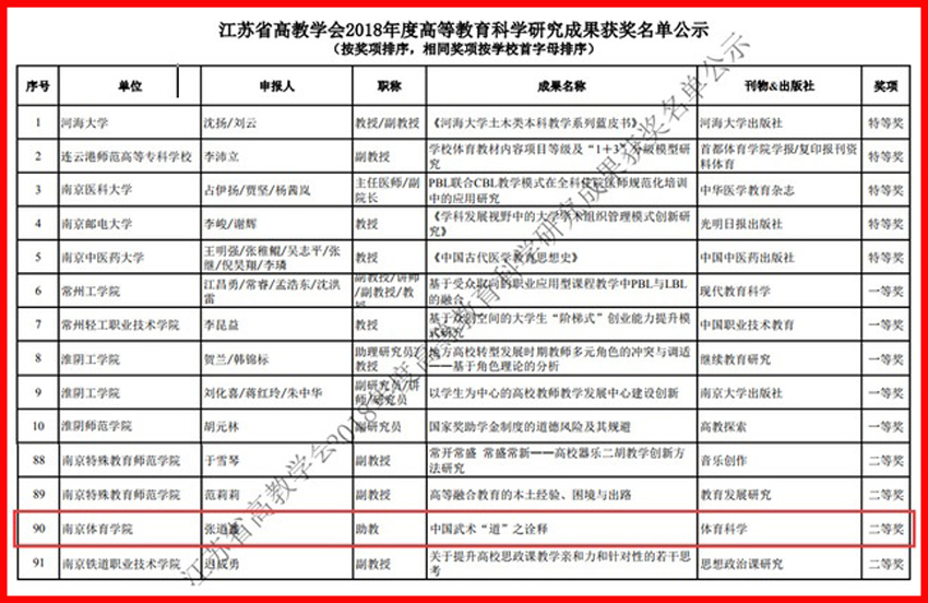 近日,江苏省高等教育学会公示了2018年度江苏省高等教育科学研究优秀成果奖评选结果,我校张道鑫老师申报的《中国武术“道”之诠释》一文荣获二等奖。