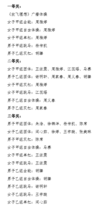 2020年12月20日,由江苏省高校体育教学指导委员会主办,江苏省高校体育教育联盟、江苏省体操运动协会承办的2020年江苏省高校体操线上比赛在线上平台成功举行。体育教育与人文学院积极组织学生参加赛事,最终选拔24名体育教育专业学生组队参加。在我校武术与艺术学院张猛老师、周靖弦老师的悉心指导下,参赛队员经过1个月的集训苦练,比赛中进行紧张激烈的角逐,荣获一等奖六项、二等奖六项、三等奖十一项。