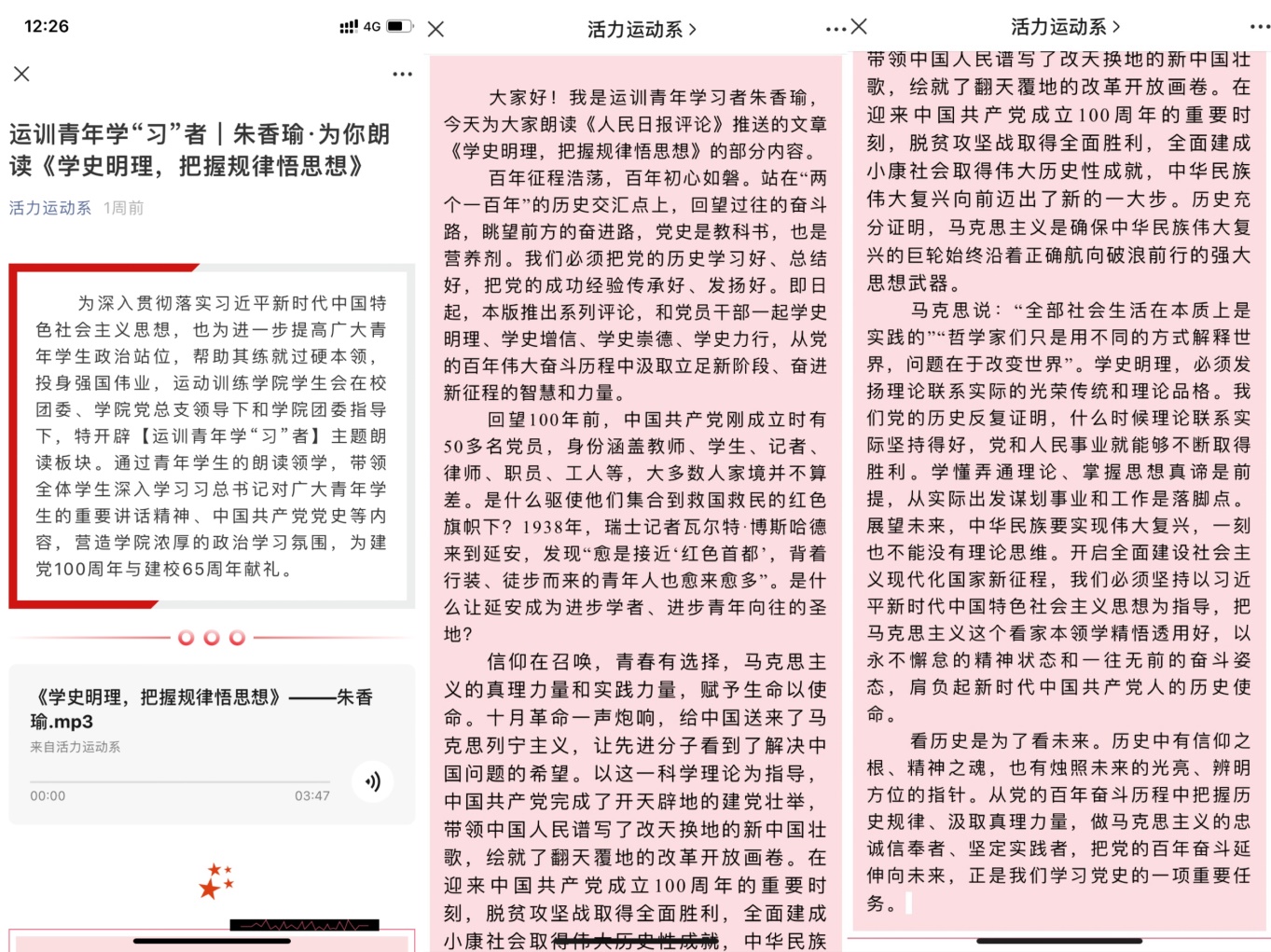 通过运动训练学院官方公众号“活力运动系”,打造“运训青年学习者”主题朗读板块,团员青年领读领学《人民日报》、《光明日报》、《中国青年报》等栏目推送的文章,进一步提升全体学生政治站位,深刻感悟中国共产党始终不渝为人民的初心宗旨。