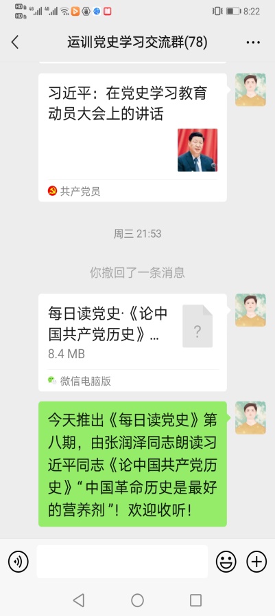 根据《运动训练学院党总支党史学习教育计划》安排,运动训练学院党总支精心策划党史学习教育,自3月22日起,推出党员“每日读党史”活动,每天由一名党员诵读《习近平论中国共产党历史》和《毛泽东 邓小平 江泽民、胡锦涛关于中国共产党历史论述摘编》一篇文章,发布在“运训党史学习微信交流群”,供大家收听学习,计划在七月一日建党100周年之际,推出100期“每日读党史”,用学思践悟的丰富成果为建党100周年与建校65周年献礼。