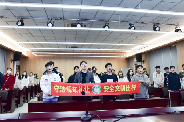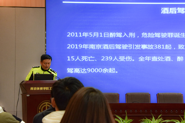 11月30日下午,南京交警一大队走进南京体育学院,通过讲演、播放安全警示视频、安全小知识提问等形式,让南京体育学院的大一新生们对交通安全有了更为深刻地认识,对违反交通法规所导致的恶劣后果也有一定的了解,在场的学生们积极提问,现场民警耐心回复解释。讲演结束后学生们自发的拿起横幅,喊出响亮的口号“守法规知礼让,安全文明出行”。