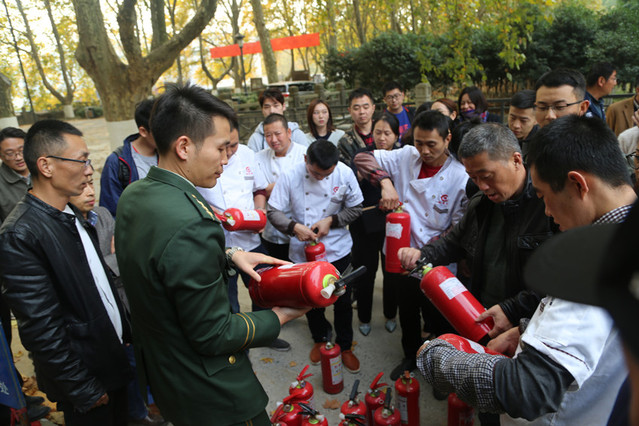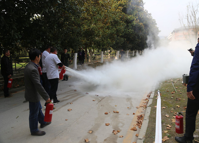 玄武区消防大队夏前勇参谋讲解、示范灭火器使用方法、注意事项