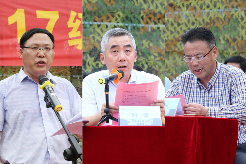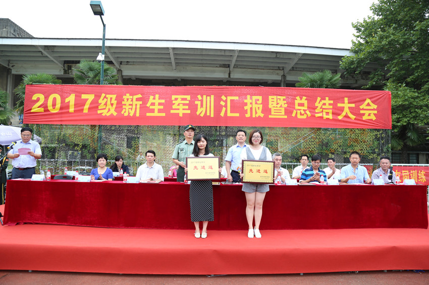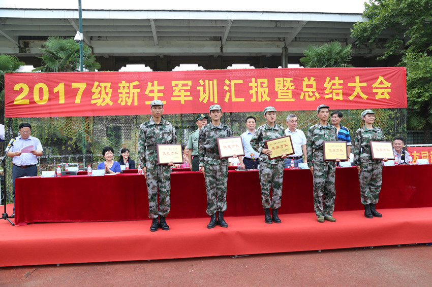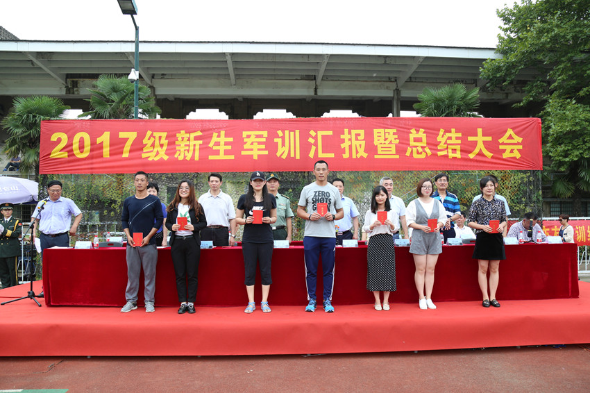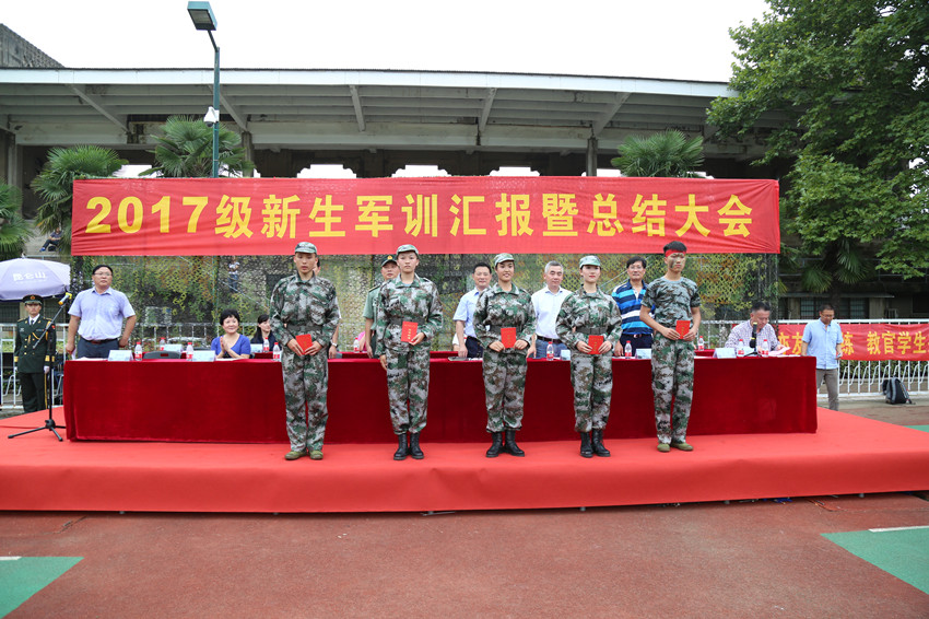 汇报表演结束后,校人武部部长、保卫处处长、军训工作领导小组副组长、军训大队政委王竹林作军训工作总结,校党办、校办主任刘健宣读《关于表彰2017级新生军训“先进集体”和“先进个人”的决定》和《关于表彰2017级新生军训内务“标兵宿舍”的决定》。大会表彰了军训“优秀学员”137人、军训“优秀管理人员”7人、军训“优秀教官”11人、军训“汇报表演优胜方队”5个、军训“先进连”2个。主席台前排就座领导为获奖集体和个人颁奖。