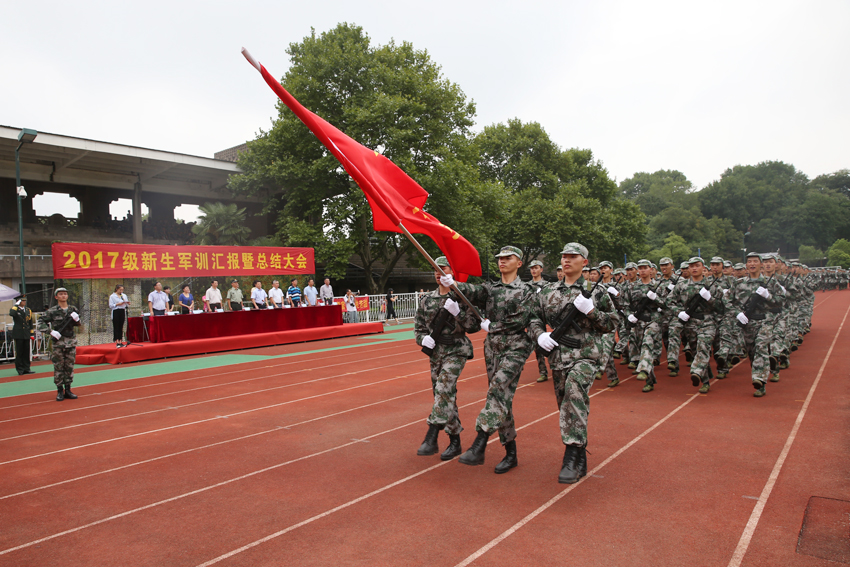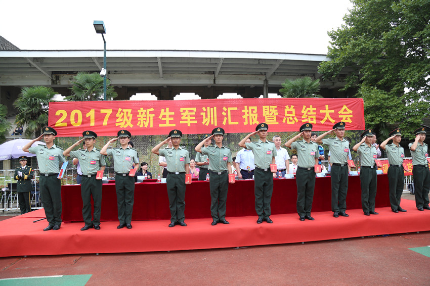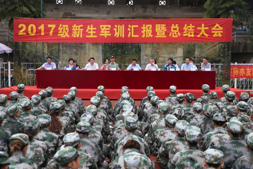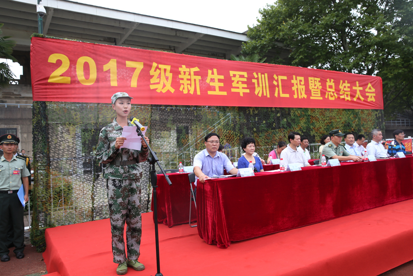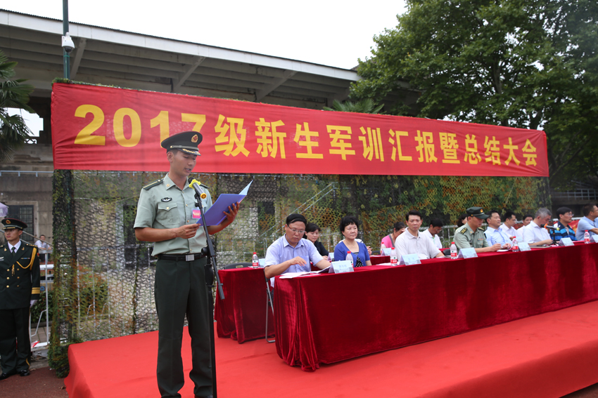 9月26日下午,我校2017级新生军训汇报暨总结大会在灵谷寺校区中央体育场隆重举行。副校长、军训工作领导小组组长金松,解放军陆军工程大学野战工程学院学员大队大队长王哲出席大会。校军训工作领导小组成员、施训官兵、跟训辅导员、跟训班主任和2017级全体新生参加了大会。大会由校学工处处长、军训工作领导小组副组长、军训大队政委唐存楼主持。