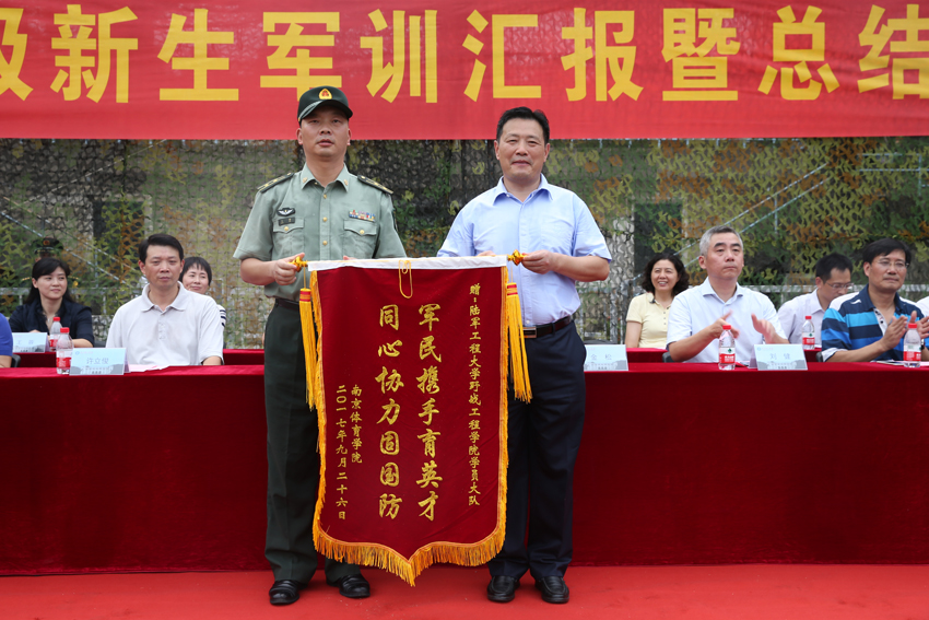 金松副校长代表学校向解放军陆军工程大学野战工程学院学员大队大队长王哲赠送锦旗