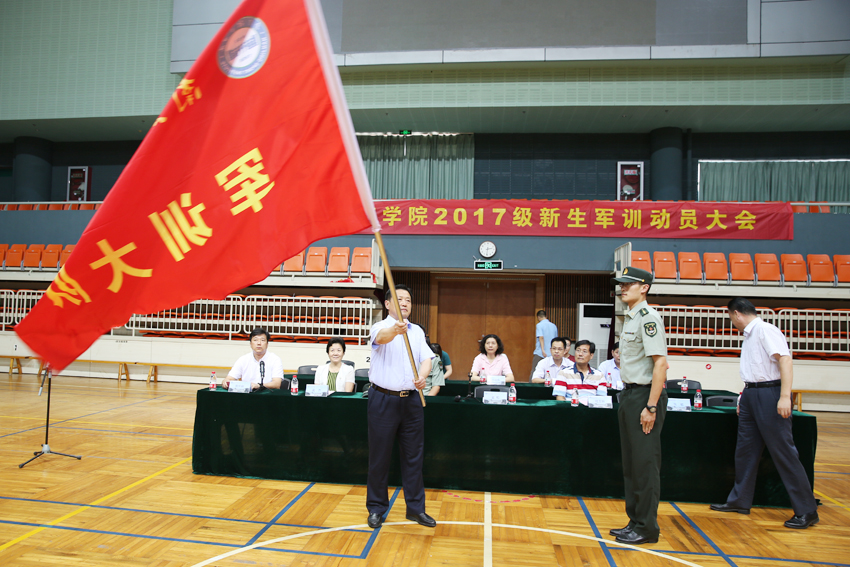 金松副院长向2017级新生军训大队授旗,2017级新生军训大队副大队长别林接旗。