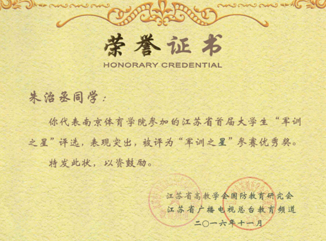 近期,江苏省首届大学生“军训之星”颁奖典礼在省广播电视总台教育频道举行。在此次省首届大学生“军训之星”评选活动中,我院荣获“优秀组织奖”,体育系朱治丞同学荣获“参赛优秀奖”。
