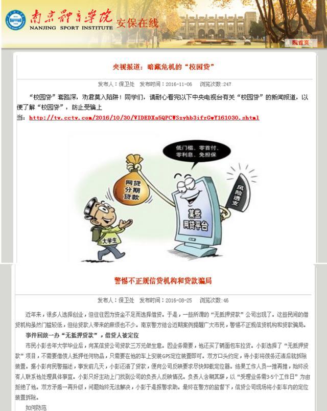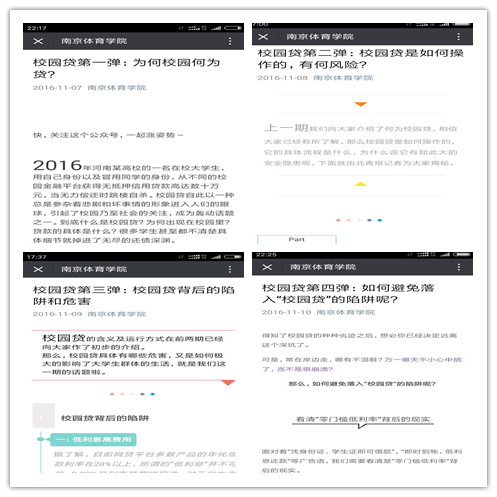 在专题宣传教育活动中,我院着重做好以下几项工作:一是将防范校园不良网贷作为学生、运动员日常教育的重要内容,通过张贴文件公告、制作专题展板、发布预警通知,观看央视有关“校园贷”的调查视频,推送“校园贷”风险防范系列主题微信,加强“校园贷”风险防范警示工作;二是教育引导学生、运动员谨慎使用个人信息,不随意泄露个人信息,提醒学生、运动员合理安排生活支出。同时,警示学生、运动员不要盲目相信推销的各类网贷业务,尤其要警惕熟人推销的网贷业务;三是院保卫处、学工处、训练处、团委等部门密切配合,共同关注网络借贷业务在校园内拓展情况和学生、运动员异常消费行为,加强日常排查摸底工作;四是进一步做好经济困难学生、运动员精准帮扶工作,加强奖助学金及相关贷款的政策宣传,建立健全资助体系,拓宽资助渠道。