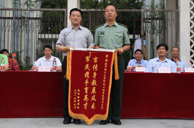 接着,金松副院长代表学院向王哲大队长赠送锦旗。锦旗上书“言传身教展风采,军民携手育英才”14个烫金大字,表达了双方在互助合作中结下的深厚友谊和取得的丰硕成果。