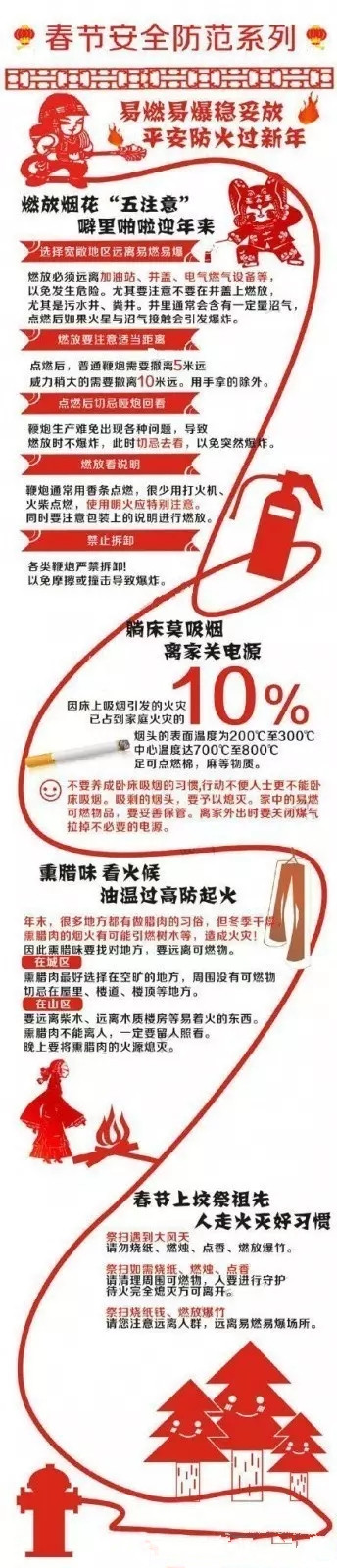 临近春节,天干物燥,用火用电用油用气量增加,燃放的烟花爆竹、祭祀所用的香油纸钱....这些都是容易引发火灾的隐患,需要得到我们的重视。提示:杜绝火患,注意人身安全!
