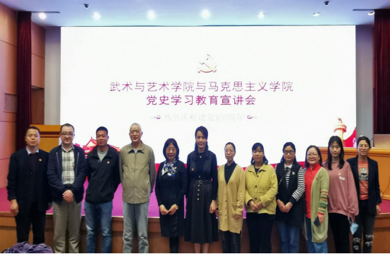 4月27日下午,马克思主义学院赴武术与艺术学院进行党史学习教育宣讲。宣讲会在图书馆第一报告厅举行,马克思主义学院直属党支部书记、副院长葛翠柏进行《胸怀千秋伟业 恰是百年风华》专题党课。宣讲由武术与艺术学院党总支书记殷怀刚主持,马克思主义学院全体教师、武术与艺术学院全体党员、入党积极分子、学生干部以及离退休工作处领导和老师参加了本次宣讲会。