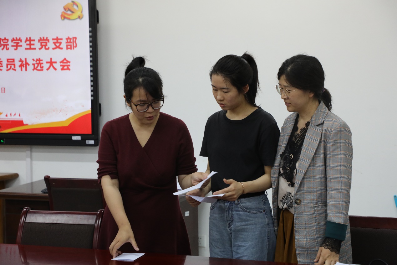 随后,乐晓云老师现场宣读《体育教育与人文学院学生党支部党员大会选举办法》与本次支部委员补选大会候选人名单。到场党员进行投票表决,采用无记名投票方式和差额选举办法,由监票人郭卫玲,计票人乐晓云和沈璇进行现场唱票,并宣读表决结果。宋树梅当选为体育教育与人文学院学生党支部委员。