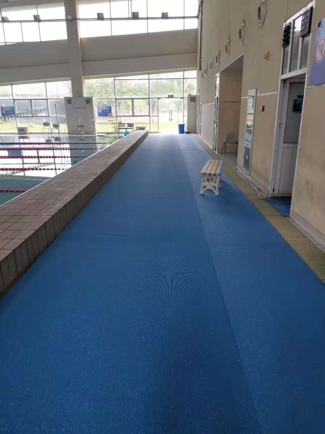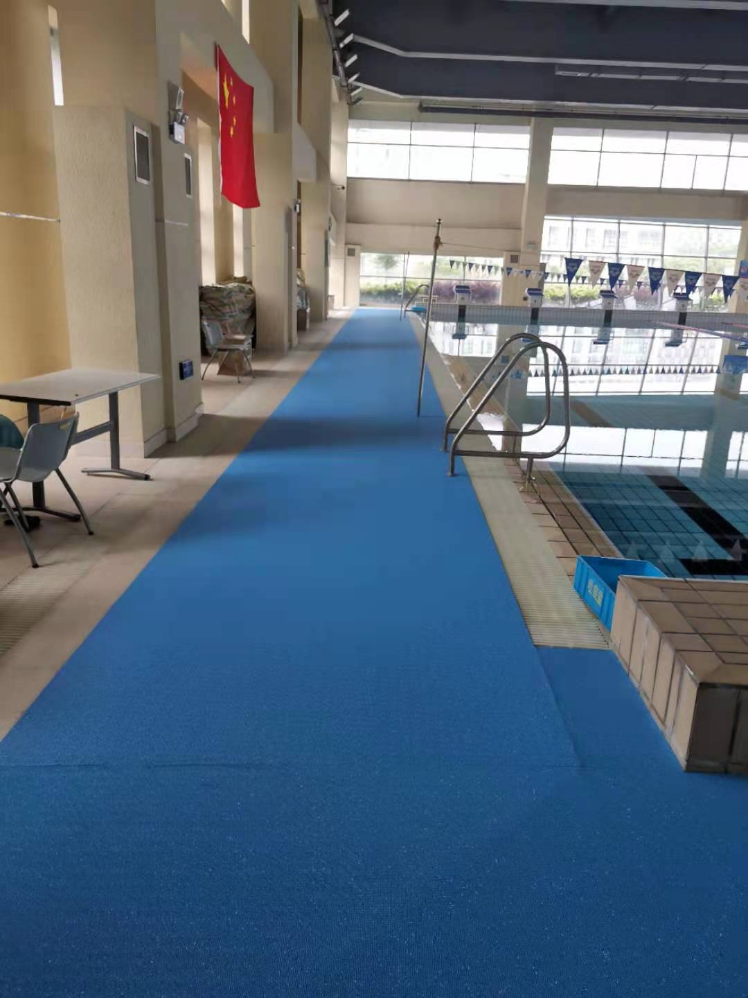 仙林校区游泳馆泳池边设计有一定坡度,沾水易滑,偶有学生滑倒现象,存在一定安全隐患。安全无小事,针对此问题,学院党总支积极落实校党委要求和校3+1督查的反馈建议,并将解决游泳池防滑工作纳入学院“我为群众办实事”工作计划。在先期落实安全教育、安全提示的基础上,通过调研,研究制定游泳池防滑方案,决定在游泳池四周加铺防滑垫。