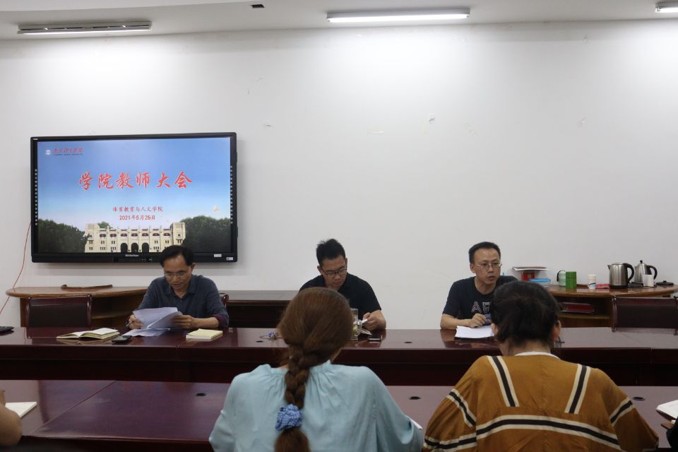 李金宝为全体教师领学了习近平总书记《论中国共产党历史》中“知史爱党,知史爱国”相关内容,并通报了体育教育与人文学院各党支部开展党史教育情况。认真学习党史,国史,了解党和国家事业的来龙去脉,汲取党和国家的历史经验,是教育教学中不可缺少的部分。他要求学院全体教师进一步带领学生开展党史学习教育系列活动,形成学习党史知识教育的良好氛围。叶强传达了全校学生工作会议精神,并着重针对会上提到的相关问题提出了工作建议。他要求,学院全体教师要主动加强与学生的交流和联系,走入学生中去,积极参加学生活动,高度重视各项安全工作。