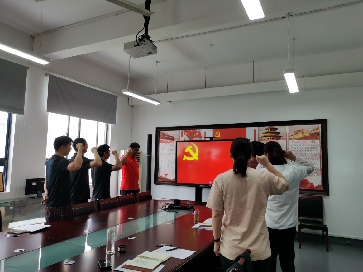 会议最后,全体党员面对鲜红的党旗,高举右拳,庄严宣誓,重温入党时对党和人民的庄严承诺。