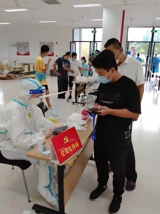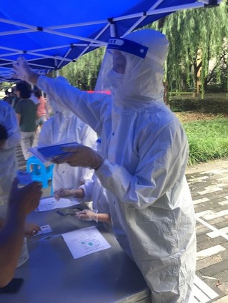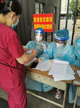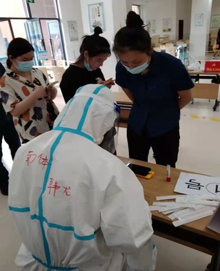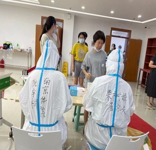 同一时间,大二的五名同学也分别在玄武区孝陵卫街道科利华中学和秦淮区夫子庙街道、大光路街道参加志愿者服务工作。其中韩龙、许兴媛和吴津莹三位同学都非南京本地人,在得知禄口机场“沦陷”后的第一时间,三人将早已买好的返乡车票果断取消,毅然决定留守南京,服务南京。韩龙同学说:我们三人相约去做核酸检测,检测之后就向工作人员提出要加入志愿者服务工作。我们每天的工作主要是将条形码标签贴在核酸检测试剂管上并录入检测者的身份信息。在那里,我们生平第一次穿上了防护服,口罩和护目镜在脸上勒出道道印痕。不到一小时就出现恶心,呼吸困难等各种不适感,深夜,当脱下防护服时全身衣衫被汗水浸透,筋疲力尽,整个人似乎进入半虚脱状态,而在乌衣巷社区党群服务中心的熊雨晨同学也同样体会着浑身被包裹的不适感。熊雨晨说:从7月28日就开始协助社区工作人员帮助没有“苏康码”的老人开具相关证明,并为“黄码”和隔离的居民答疑解惑,同时协助社工进行防疫宣传的相关工作。29日又参与到乌衣巷社区第三轮全民核酸检测的工作当中直至深夜。同在秦淮区的王姝懿同学虽然不用忍受防护服带来的闷热感,但她所志愿服务的社区存在机场人员以及同住家属的较多,王姝懿同学负责每天的信息录入与打电话核实工作,在她协助下,社区街道的工作效率大大提高。王姝懿说:虽然不在第一线,但同样可以用实际行动转递积极的抗疫态度,为数据排查贡献一份力量。我只是万千志愿者中的小小一员,但是我会继续坚守岗位,帮助南京一起打赢这场胜战。韩龙和熊雨晨表示:作为入党积极分子守护古城我们责无旁贷,我们散装五人小分队将继续抗疫志愿服务工作,哪里需要我们,我们就去哪里。