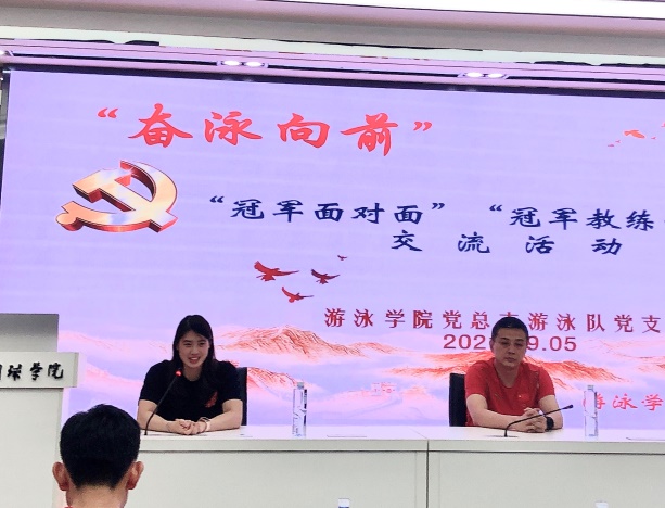 9月5日16:00,游泳学院党总支游泳队党支部在中国网球学院三楼会议室举行“冠军团队面对面”主题交流活动,邀请张雨霏和她的东京奥运会备战团队成员现场交流东京奥运会夺冠的成功经验。游泳学院党总支书记、院长王伟新,党总支副书记陈志,游泳队在校全体管理干部、队医、教练员、运动员参加了会议。会议由游泳队党支部书记张纪芳主持。