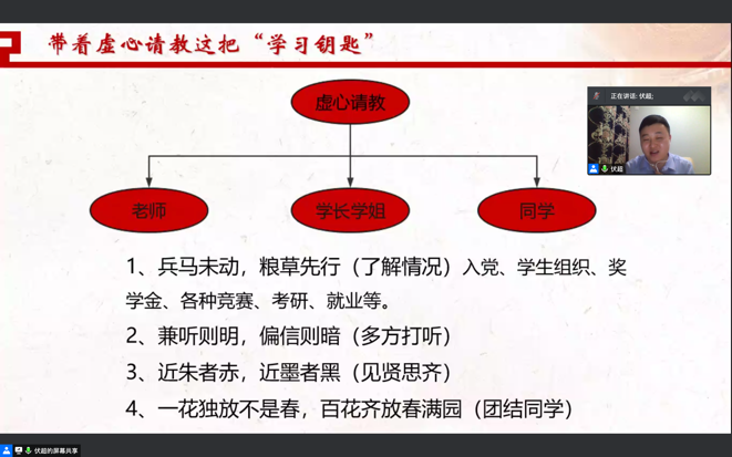 讲座中,伏超老师结合自身学习与工作的经历,指出大学生涯需掌握“四把钥匙”:虚心求教、明确目标、积极主动、努力拼搏。大学生在校期间要把学习放在第一位,提高自觉性与效率;学生干部要提高思想政治素质,争做勤劳的“店小二”;时刻关注就业形式,明确目标定位;积极向上,努力做到“向真、向善、向美、向上”。