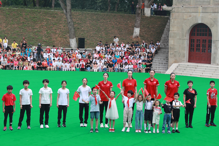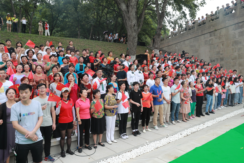 7月6日上午,南京体育学院校园内红旗招展,千人攒动。来自江苏各行各业的2000多名优秀代表齐聚南体校园,放声高歌,礼赞祖国。大家合唱的歌曲是《红旗飘飘》。