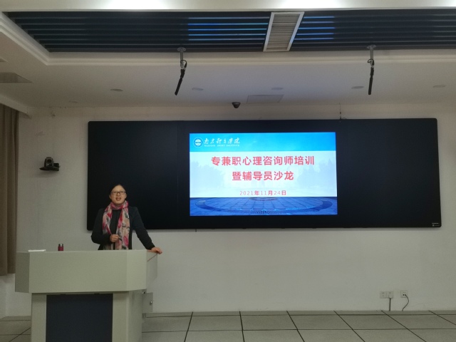 为进一步提升我校心理健康教育专兼职教师队伍的知识储备与专业技能,11月24日上午,我校在图书馆第二报告厅举行了专兼职心理咨询师培训暨辅导员沙龙活动。本次培训邀请了南京航空航天大学学生处心理健康教育中心倪亚红副教授,对与会教师进行了心理咨询相关专业知识的培训。活动由学生工作处处长唐存楼主持,各二级学院副书记、全体辅导员、专兼职心理咨询师和学工处工作人员参加了本次活动。