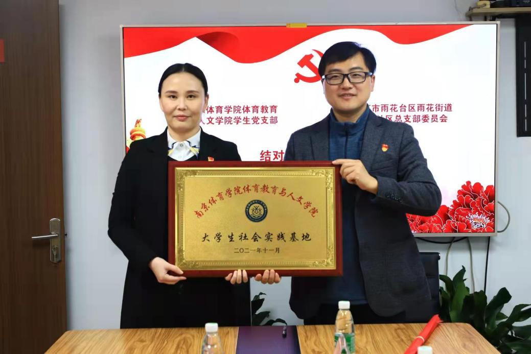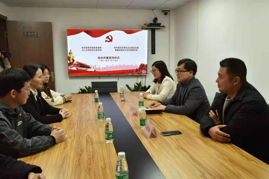 为进一步贯彻落实中央关于党要管党、全面从严治党的工作要求,11月27日,南京体育学院体育教育与人文学院学生党支部与中共南京市雨花台区雨花台街道康盛花园社区总支部委员会进行结对共建签约仪式。体育教育与人文学院党总支副书记卢奎、学工办主任赵玉超、分团委副书记宋树梅和雨花台街道康盛花园社区党总支书记尹萍等人出席结对共建签约仪式。