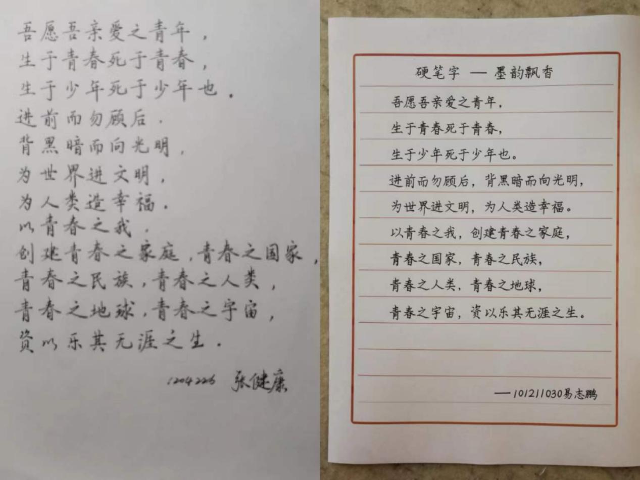 本次比赛采用线上投稿方式,学院师生积极参与本次活动,用心书写每一笔画,用情传递每一句话,上交了一份份各具特色的作品。其中,硬笔字劲隽美,粉笔字工整清秀,毛笔字遒劲流畅,配音作品字正腔圆、声情并茂,将对党的感恩情怀化作一个个字符与音节,抒发对党和国家的满腔热忱。
