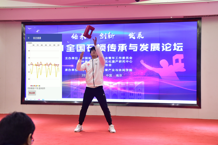 在成果汇报及节目展演中,我校教师团队研发的《石锁运动的课程开发与实践》华彩呈现。充分展示了我校在体育非遗项目课程开发中的创新成果。南京石锁运动协会刘孝建、石锁健身达人郭加林带来了精彩的传统石锁表演。月上柳梢,怀中抱月,大鹏展翅等招式演绎了传统石锁穿透岁月漫长的历史积淀。来自兴化市戴南董北实验小学的石锁健身操《锁漾青春》,生动呈现了石锁运动的健身功能和体育非遗项目的新时代传承。南京体育学院学生表演的《锁跃飞扬》突出抛、接、旋转与翻滚技术,在提高身体力量、灵敏、协调及调节内脏机能的同时,实现健身与娱乐、运动与表演的有机融合。同时,我校学生在智能石锁表演中所使用的器材,是由我校课程团队自主研发的智能e石锁,可准确识别运动类型,记录练习时间、动作数量,计算所消耗的能量,评估动作质量,实现智能打分,创新推动了石锁运动的现代发展。
