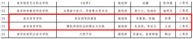 近日,江苏省高等学校教育技术研究会公布了2021年“领航杯”江苏省大学生信息技术应用能力比赛暨首届人工智能大赛获奖名单,我校喜获三等奖2项,分别为彭勇老师指导的《脊柱侧弯的康复》、王斌老师指导的《腰肌劳损防治的理论与实践》。