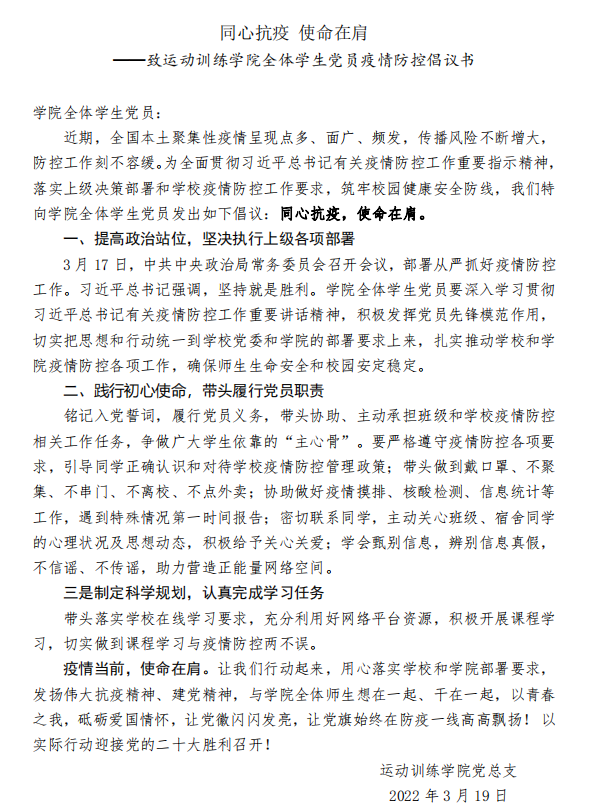 一名党员就是一面旗帜,一个支部就是一座堡垒。运动训练学院学生党员迅速行动起来,认真落实各级党组织部署要求,发挥党员先锋模范作用,齐心协力、同舟共济、科学防疫。将通过积极参与学校疫情防控工作,履行一名党员的义务,为学校打赢疫情防控阻击战贡献自己的力量,为师生的身体健康和生命安全保驾护航。