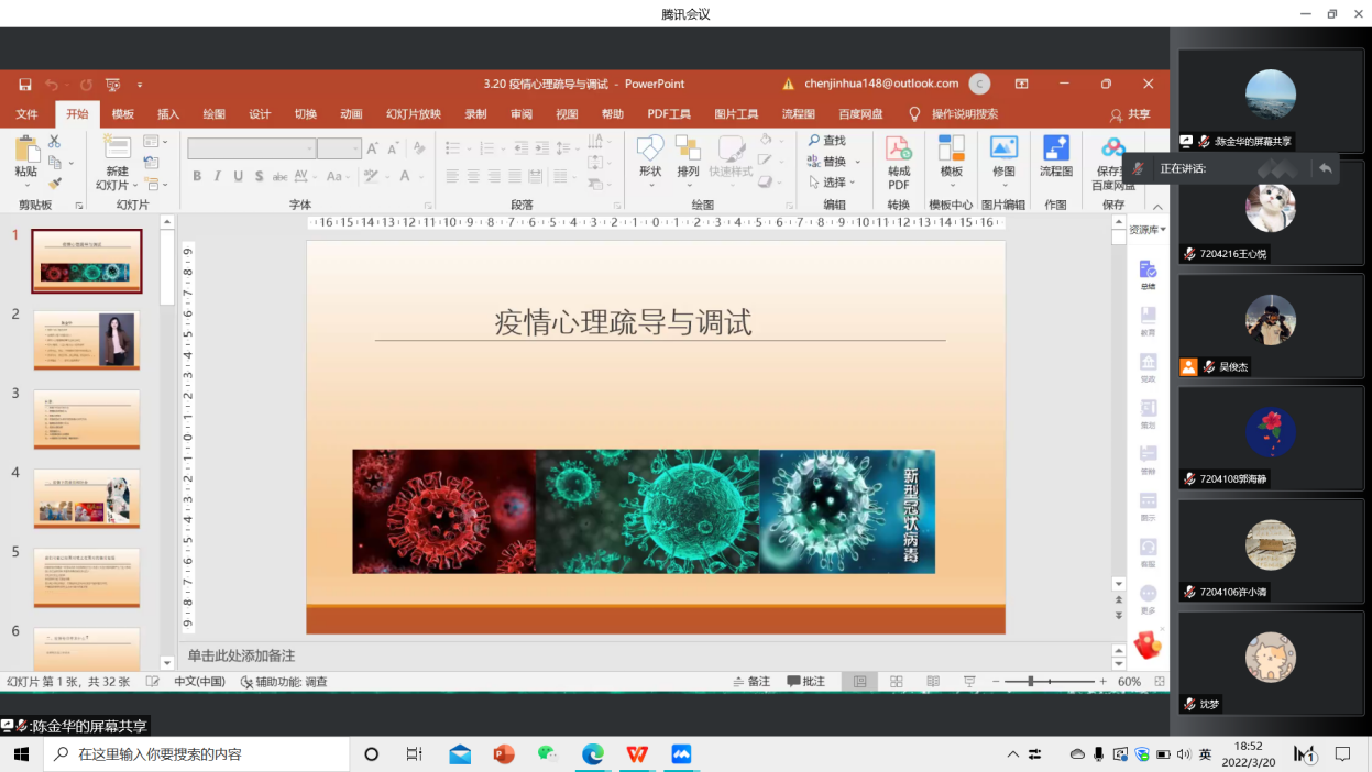 为纾解学生在疫情防控校园封闭管理期间产生的不良心理影响,使同学们掌握科学的心理疏导与调试方法,体育教育与人文学院于3月20日召开疫情心理疏导与调试的专题讲座,特邀国家二级心理咨询师陈金华主讲。体育教育与人文学院党总支副书记卢奎出席讲座。讲座由辅导员沈梦主持,体育教育与人文学院全院同学通过线上方式学习了讲座内容。