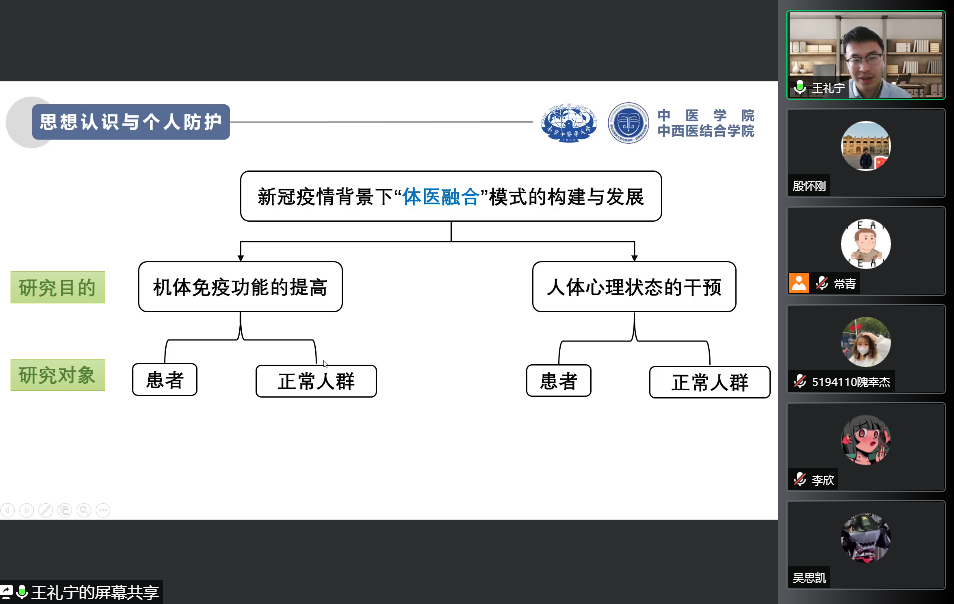 为进一步增强同学们抵御新冠疫情的意识、持续做好疫情防控工作,武术与艺术学院于3月29日中午开展了线上疫情防控讲座。本次讲座由学院党建共建单位南京中医药大学中医学院·中西医结合学院王礼宁博士主讲,武术与艺术学院党总支副书记陈荣梅主持讲座。