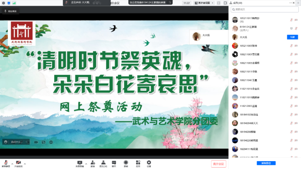 崇尚英烈、缅怀英烈、学习英烈、捍卫英烈。党的十八大以来,习近平总书记缅怀英烈的足迹遍布祖国大江南北。每一次庄重的鞠躬,每一次深情的凝望……都寄托了他对革命先烈和人民英雄的深切缅怀与致敬。恰逢清明,怀思追远,武术与艺术学院分团委组织了线上清明祭奠活动。