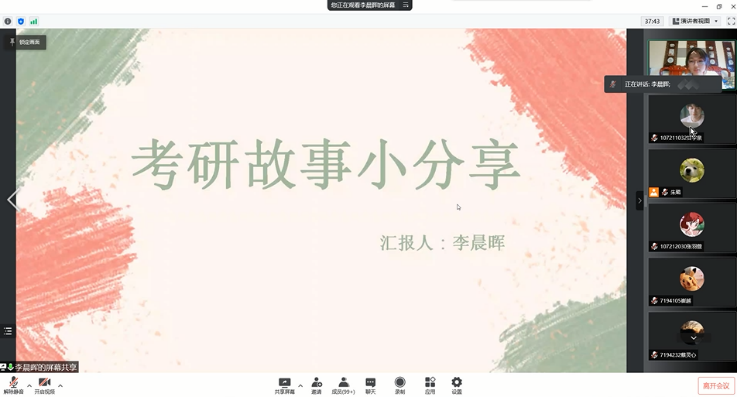 分享会上,李晨晖、朱璐、马上茗、丁婧文四位成功上岸的学长学姐分别与大家分享了各自的备考经验,详细介绍了他们所考入的院校和专业的基本信息,让同学们对考研的整体流程有了初步了解。几位同学都强调了“要充分认识你自己”,对于自己的专业偏好、地理位置、未来目标等方面要有清晰而客观的认识,并且备考期间不能一味学习,应适当去活动去放松,保持良好的状态与较高的效率。四位同学还向大家详细地分享了他们复习的时间线及公共课的经验,“考研是一场持久战”,战线不宜拉太长,也不宜太短,一旦开始准备便要全力以赴,一定“不要拖”。学姐学长们还建议大家掌握好英语与政治这两门必考科目,多刷真题、新题型,根据自身实际情况选择相应的辅导资料,努力提升自己的成绩。