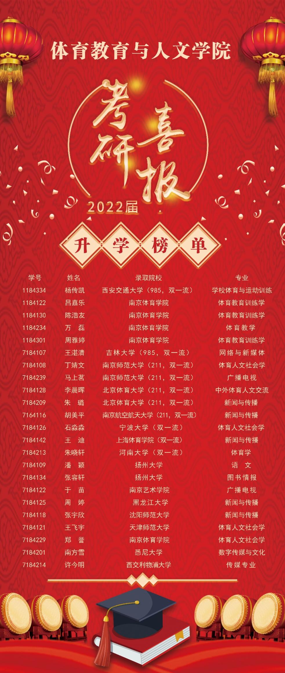 近日,2022年全国硕士研究生录取结果陆续揭晓,体育教育与人文学院考研学生捷报频传,共有23位优秀学子被国内外高校录取,其中体育教育专业5人,新闻学专业18人,考研录取率首次突破20%。优异成绩的背后,既是考研学子们寒窗苦读、刻苦学习的结果,也是学院塑造良好学风、重视学生发展的直接体现。“一份耕耘一份收获”,学院向成功考取硕士研究生的同学表示祝贺,祝愿他们在研究生学习阶段学业有成,前程似锦。同时也希望学院全体学生以此为榜样,勤奋学习、勇创佳绩!