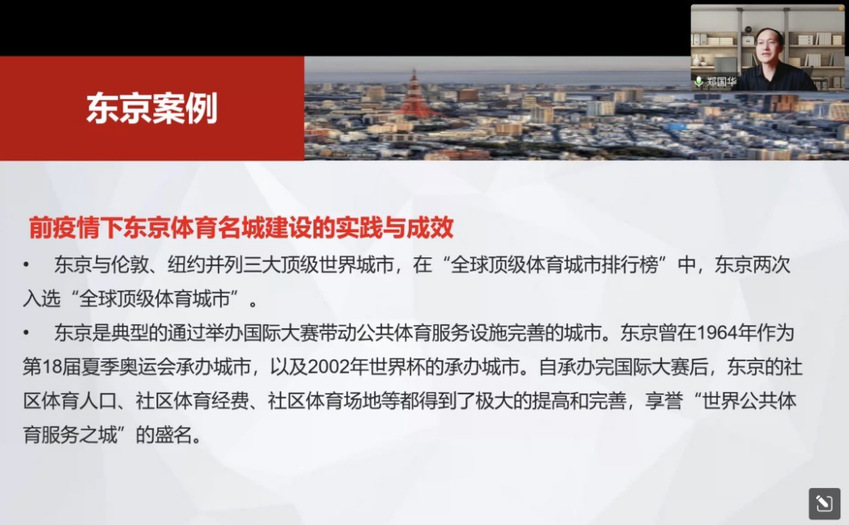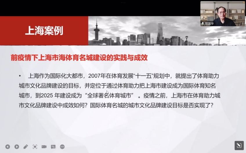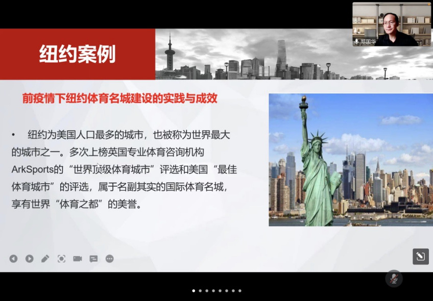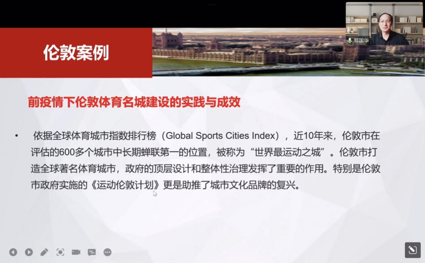 郑国华教授在讲座中梳理了近十年国内外中心城市在发展规划中提出的“建设体育城市”等目标任务,对比分析了疫情之下全球著名城市的体育影响力排名和关注热点。受疫情影响最新的全球著名体育城市排名出现了较大波动,纽约、伦敦、东京、上海等案例研究充分揭示了疫情与全球著名体育城市建设关注度转向的内在关联。报告辩证审视中外体育中心城市建设的差异和共性,对疫情之下国内外中心城市在抓住体育契机、充分发挥体育正面影响、提升城市文化国际影响、改善城市形象等方面的先进经验进行了阐释,从而为我国体育助力城市建设提供国际经验、现实途径和战略选择。