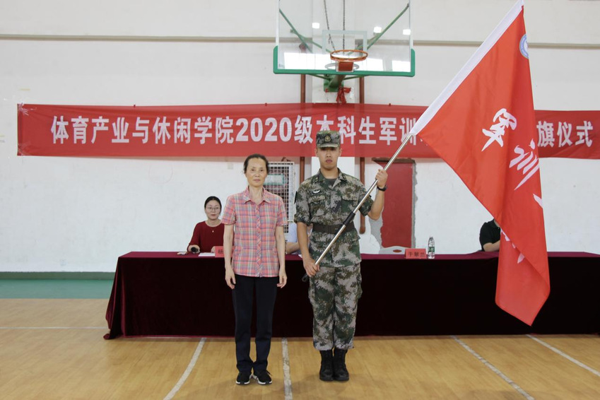授旗仪式上,于翠兰向军训五连授旗。在现场热烈的掌声中,军训教官代表徐浩洋、学员代表任志强依次发言。