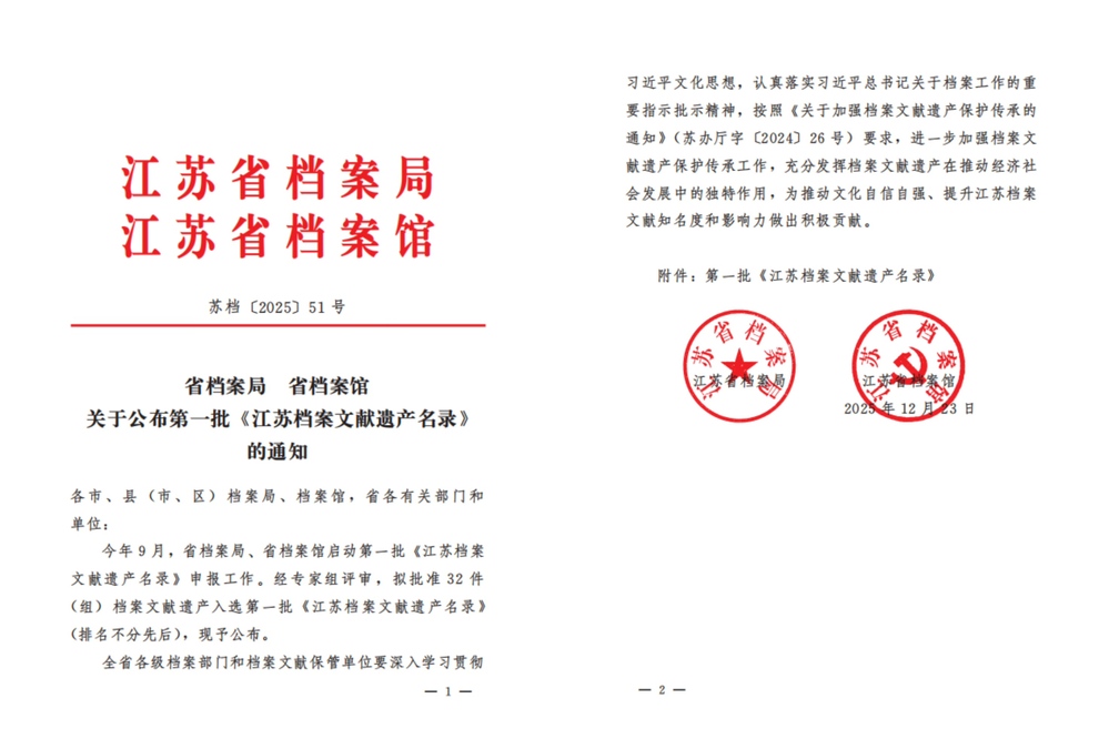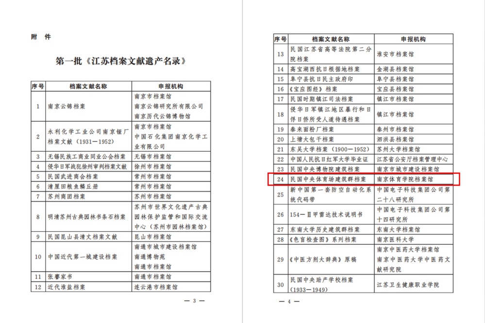 近日,江苏省档案局、江苏省档案馆公布第一批《江苏档案文献遗产名录》,我校档案馆申报的“民国中央体育场建筑群档案”成功入选,标志着该批档案的历史价值、文化价值与精神价值获得权威认可。