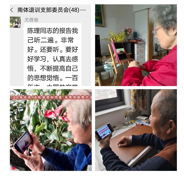 通过收看网上专题报告会,老同志们在微信群里分享交流了党史学习心得。大家纷纷表示:接受党史学习教育,做到学史明理、学史增信、学史崇德、学史力行,进一步认识到在这历史的重要时刻,学习党的百年历史的重要性。学习重温党的百年历史,我们从中汲取智慧和力量,坚定党的历史自信,坚定中国人民和中华民族的未来自信,更好地推动新时代中国特色社会主义建设事业,更好地团结带领全国各族人民决胜全面建成小康社会、踏上建设社会主义现代化强国新征程。
