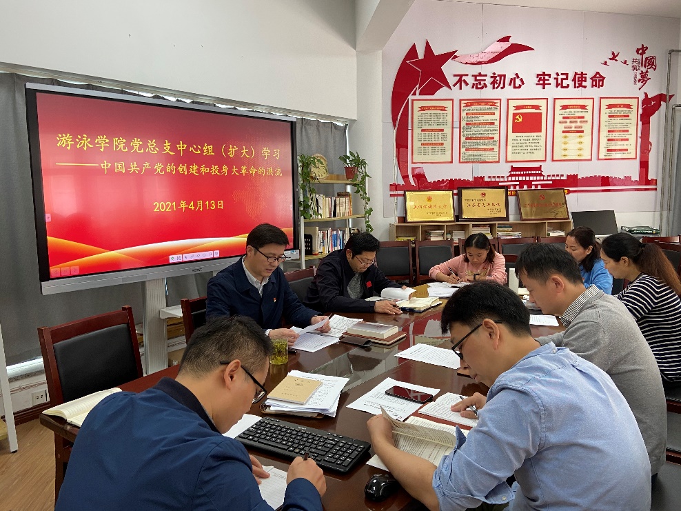 4月13日,游泳学院党总支理论学习中心组在跳水花游馆召开中心组学习(扩大)会,集体学习《中国共产党简史》第一章中国共产党的创建和投身大革命的洪流。游泳学院党总支全体管理干部参加了学习,学习会由党总支书记、院长王伟新主持。