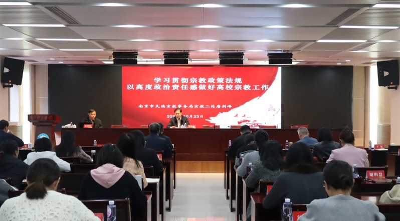 10月23日下午,南京体育学院党委理论学习中心组2025年第8次学习(扩大)会在灵谷寺校区行政办公楼101会议室召开,聚焦深入学习贯彻习近平总书记关于民族宗教工作的重要论述。会议特邀华东师范大学党委宣传部副部长梁宏亮和南京市民族宗教事务局宗教二处处长唐剑峰两位专家作专题辅导。校党委副书记、校长吴兵成主持会议,全校党委理论学习中心组成员,党委学工部、党委研工部思想政治教育工作人员以及各高等教育二级学院党总支书记、副书记、组织员、辅导员等共同参与学习。