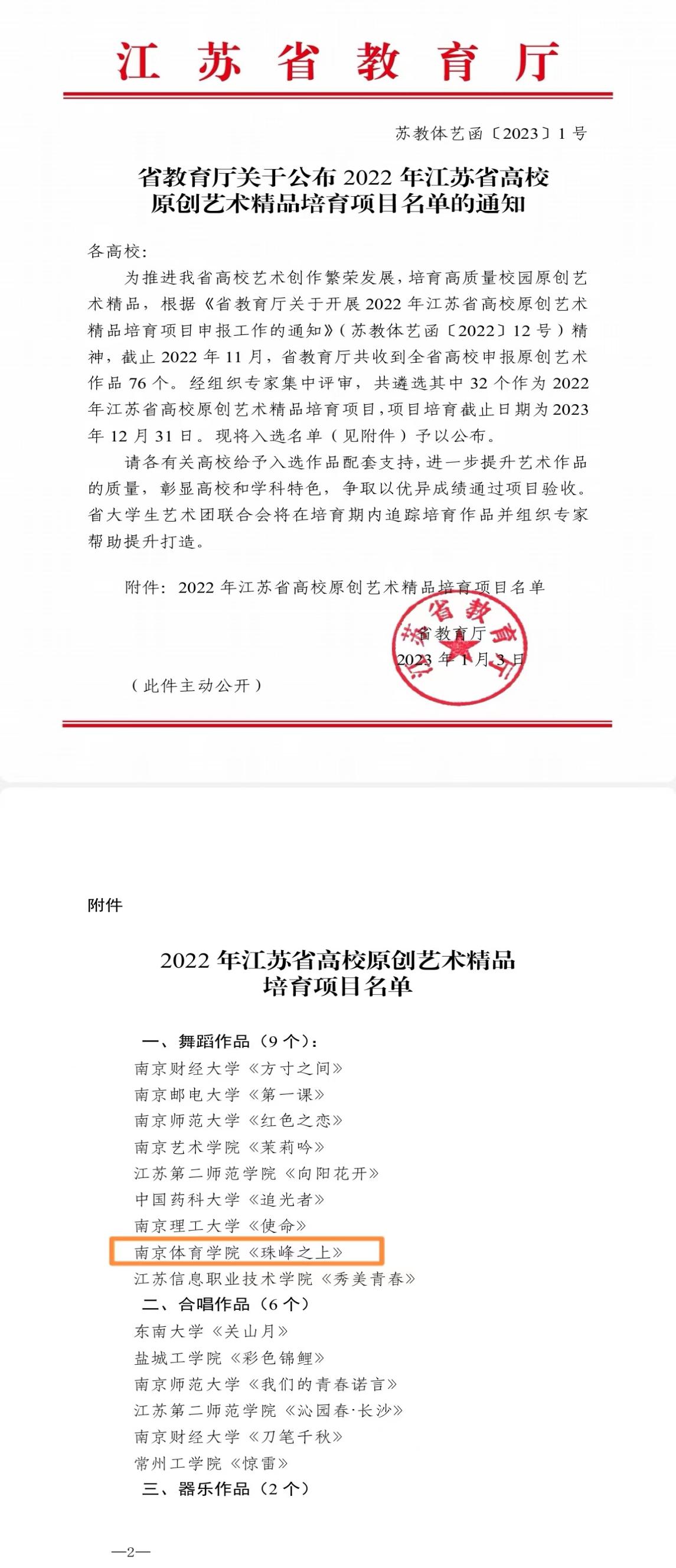 近日,江苏省教育厅公布了2022年江苏省高校原创艺术精品培育项目名单,我校武术与艺术学院申报的原创舞蹈作品《珠峰之上》成功入选。在本次原创艺术精品培育项目活动中,江苏省教育厅共收到全省高校原创艺术作品76项,经专家评审共遴选32项成为2022年江苏省高校原创艺术精品培育项目,其中舞蹈类仅入选9项。