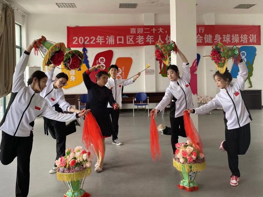 参观完毕,徐红梅领着同学们走进浦口区老年活动中心,与“茶山会”舞蹈队队员一边讲解、一边示范,手把手指导同学们学习“茶山会”舞蹈。在学习过程中,同学们对茶山会的舞蹈形式、音乐伴奏、道具服饰等有了基本的了解,并且在老师们的指导下对舞蹈的基本步伐进行了学习。“茶山会”是一种口耳相传的传统艺术形式,是一只以怡情,歌颂劳动人民幸福生活的民俗舞蹈,只有深入体验和参与其中,才能感受劳动人民的本土风情,了解“茶山会”文化的美学特征和独特魅力。