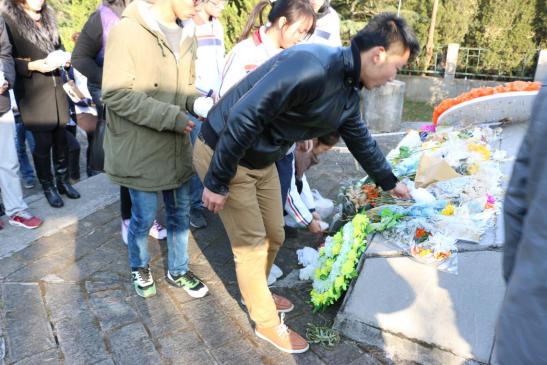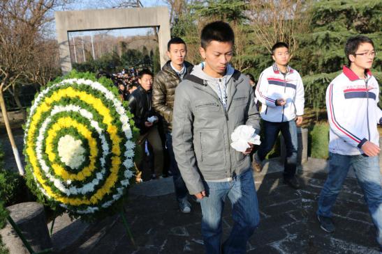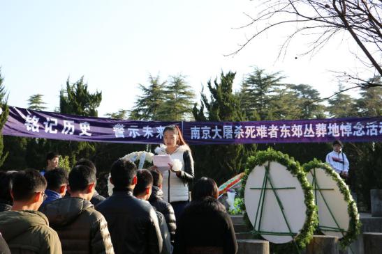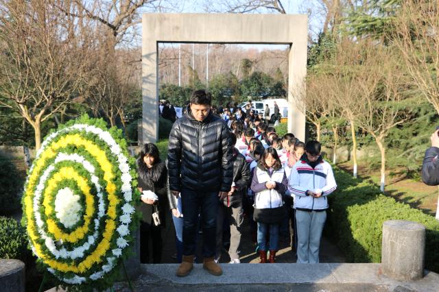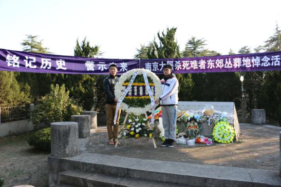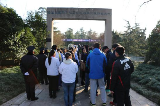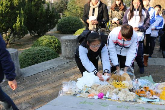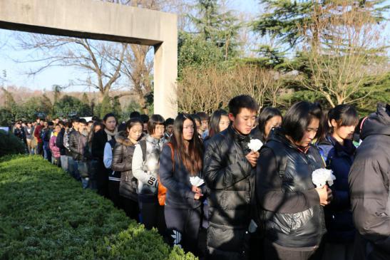 2014年12月13日上午,国家公祭日,运动系组织大学生来到南京大屠杀死难者东郊丛葬地进行悼念活动。辅导员杨孟向同学们介绍了南京大屠杀这段惨痛的历史,中国近代百年的屈辱一次次印证了“落后就要挨打”。学生代表张雨在仪式上发言,77年,青丝染成白发,那段血染历史的幸存者仍在世已不过百人。紧接着同学们为遇难者默哀1分钟,默哀完毕后同学们轮番上去为遇难者献上自己做的小白花,在献上自己的哀思后,同学们默默地退出了这片土地。陵园外,运动系副书记葛见珠慷慨激昂地向学生讲述了自己的感想,唤起了同学们维护祖国和平的满腔热情。警钟长鸣,勿忘国耻,振兴中华,从我做起!