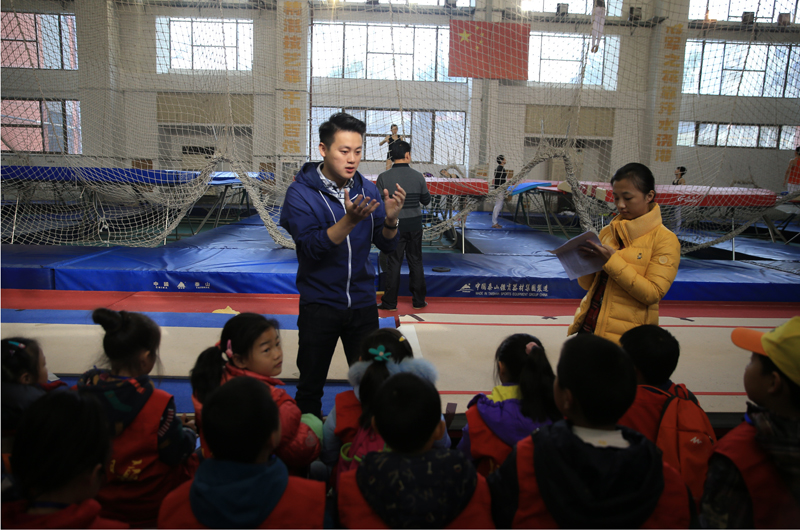 奥运冠军陆春龙为小记者讲解蹦床知识