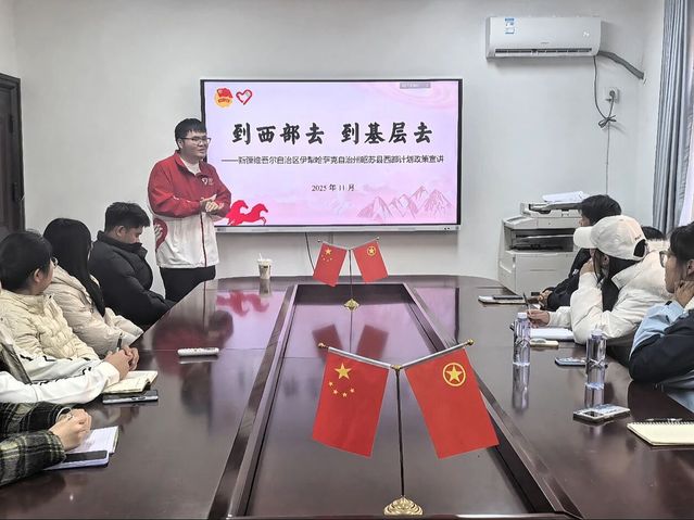 11月25日,南京体育学院团委会议室举办“到西部去,到基层去”西部计划新疆专项宣讲会,在岗西部计划志愿者齐洪斌、赵隽同学聚焦“大学生志愿服务西部计划”政策解读、服务场景与发展价值开展专题分享活动,旨在引导青年学子将个人成长融入国家战略,在基层实践中践行青春担当。