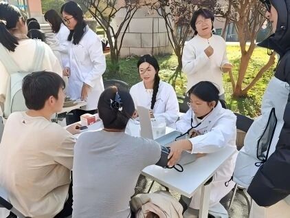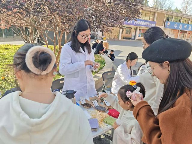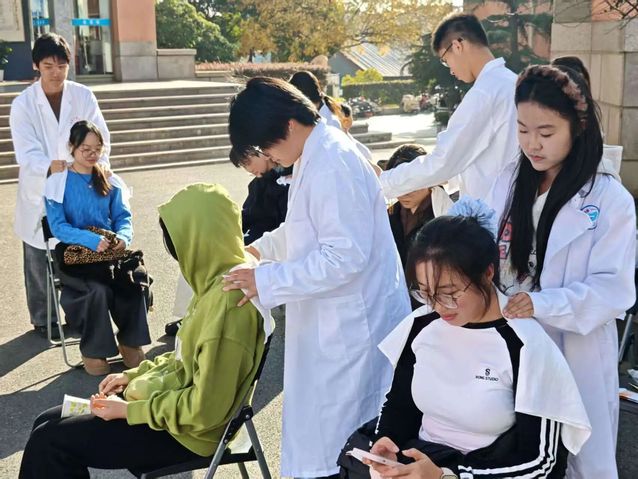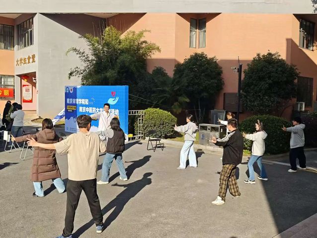 活动现场,南京中医药大学志愿者搭建服务点位,提供血压测量、血糖检测、按摩推拿、品调养茶等活动项目,南体学生自发排队参与;志愿者同步开展八段锦教学,一招一式的示范吸引围观人群,参与者跟随学习,动作规范度颇高。