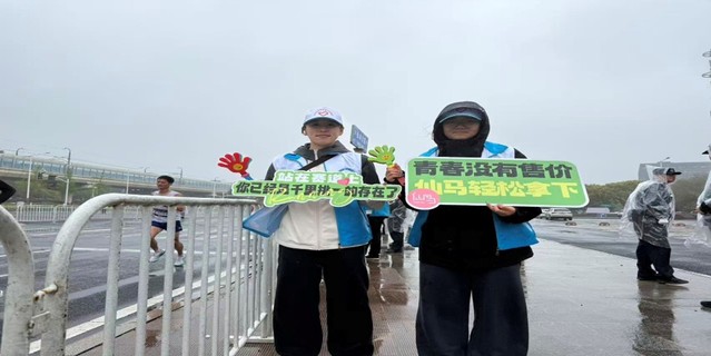 赛事期间春雨淅沥,赛道湿滑,我校志愿者们始终精神饱满、热情高涨。在赛道旁的服务点位,志愿者身着蓝白志愿马甲,手持创意应援牌,以灿烂的笑容为每一位跑者加油鼓劲。“站在赛道上,你已经是千里挑一的存在”“青春没有售价,仙马轻松拿下”,一句句青春标语搭配暖心笑容,成为风雨中最动人的风景。雨水打湿帽檐、凉意浸透衣衫,志愿者们始终坚守岗位,用笑容为跑者注入精神动力,以实际行动诠释志愿精神的深刻内涵。